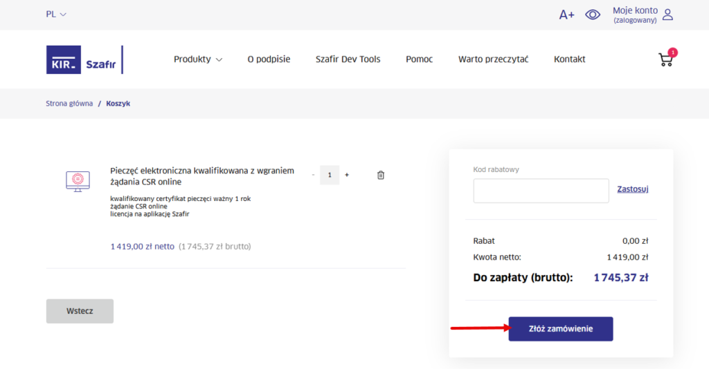 - Przejść do koszyka i kliknąć Złóż zamówienie.
