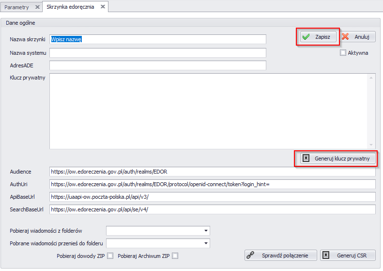 - Przejdź do: Administracja → Opcje→ Parametry programu → Skrzynka e-Doręczeń (lub utwórz nową skrzynkę)