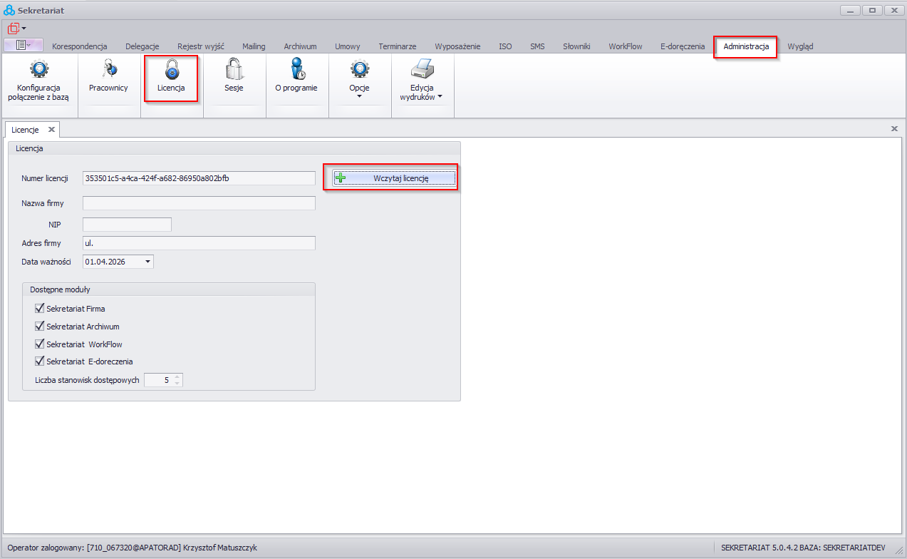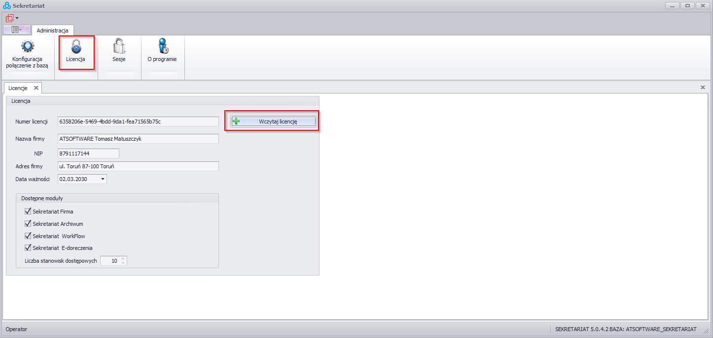 - Po pomyślnym wczytaniu formularz odświeży się i wyświetli dane nowej licencji