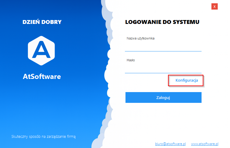- Z poziomu ekranu logowania - przycisk "Konfiguracja" (nie wymaga logowania)